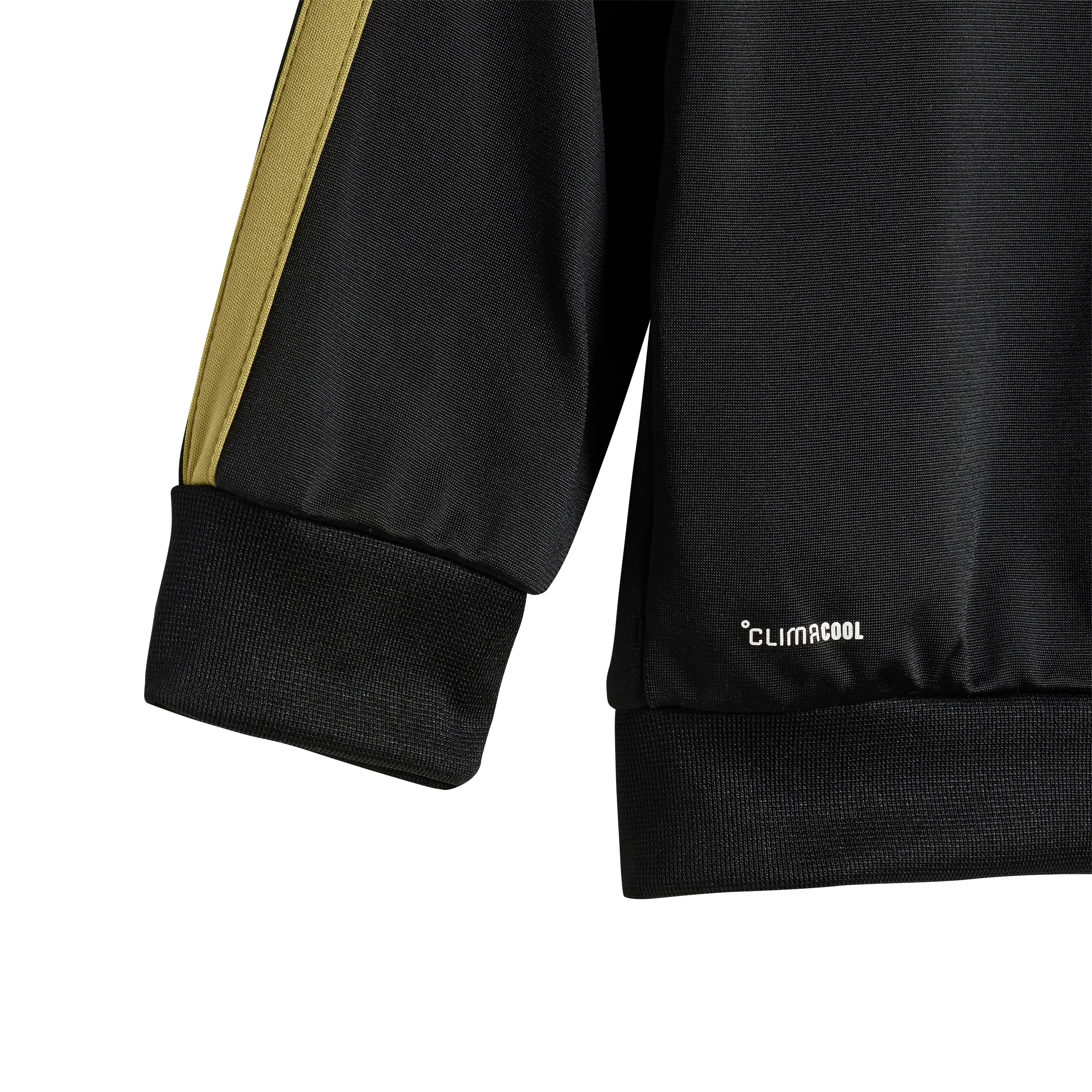Let your little explorer move in comfort and style with this adidas toddlers' tracksuit set. Whether they're off on a mission around the lounge or tackling the playground, this matching jacket and pants set keeps up with every move. Made from soft, breathable fabric, it features adidas CLIMACOOL technology to keep them cool and dry by quickly wicking away moisture. The sleek black design with bold gold detailing and classic 3-Stripes brings timeless adidas energy, perfect for active days or chill time.
